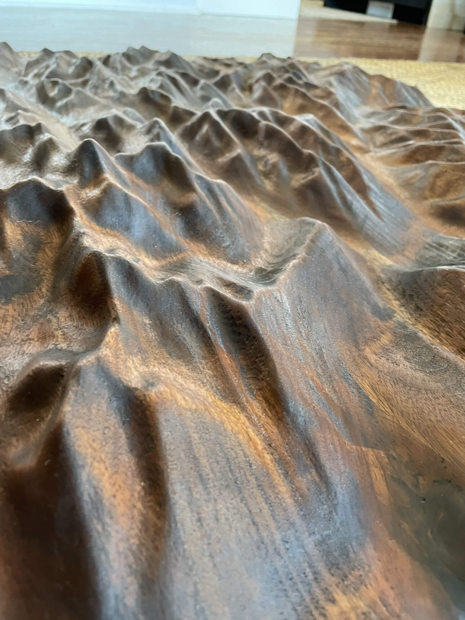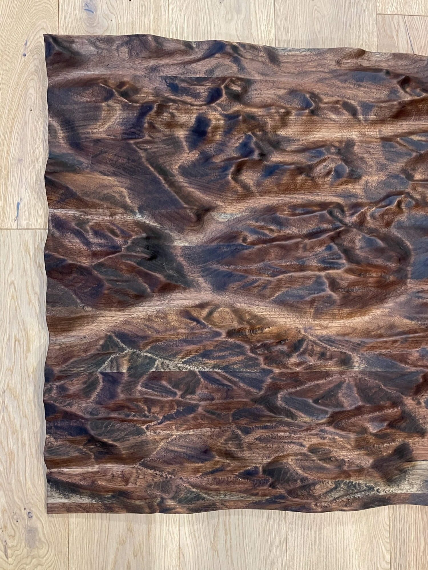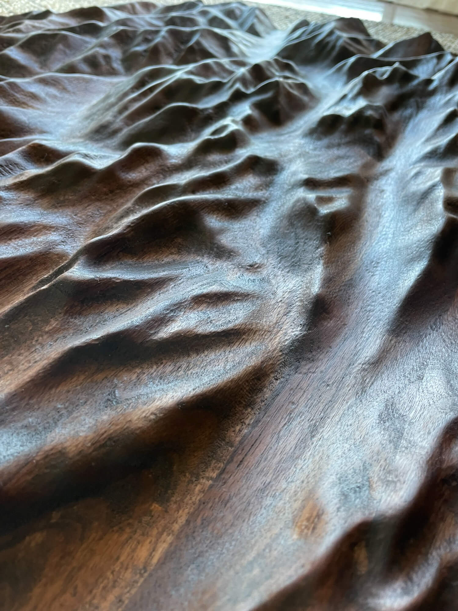 Il s'agit d'une carte topographique des montagnes Rocheuses canadiennes réalisée en bois de noyer par Adam Bezzina de Pompous Fox Wood Co. Elle a été finie avec Rubio Monocoat Oil Plus 2C de couleur "Walnut".