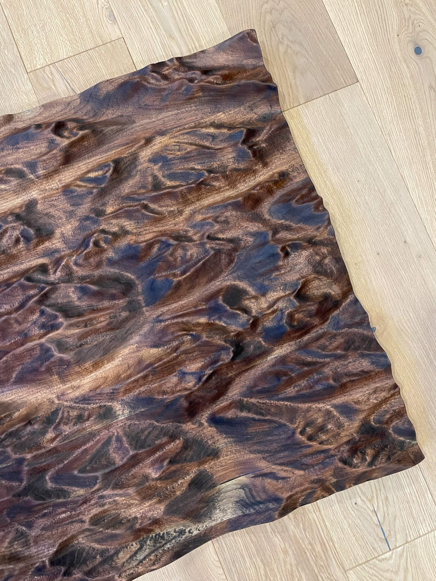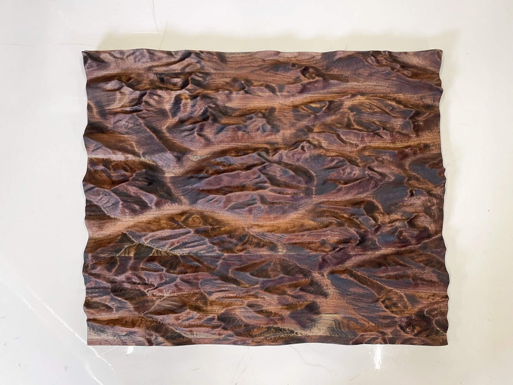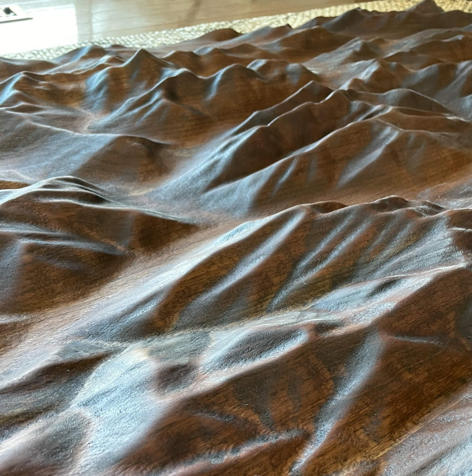 Il s'agit d'une carte topographique des montagnes Rocheuses canadiennes réalisée en bois de noyer par Adam Bezzina de Pompous Fox Wood Co. Elle a été finie avec Rubio Monocoat Oil Plus 2C de couleur "Walnut".
