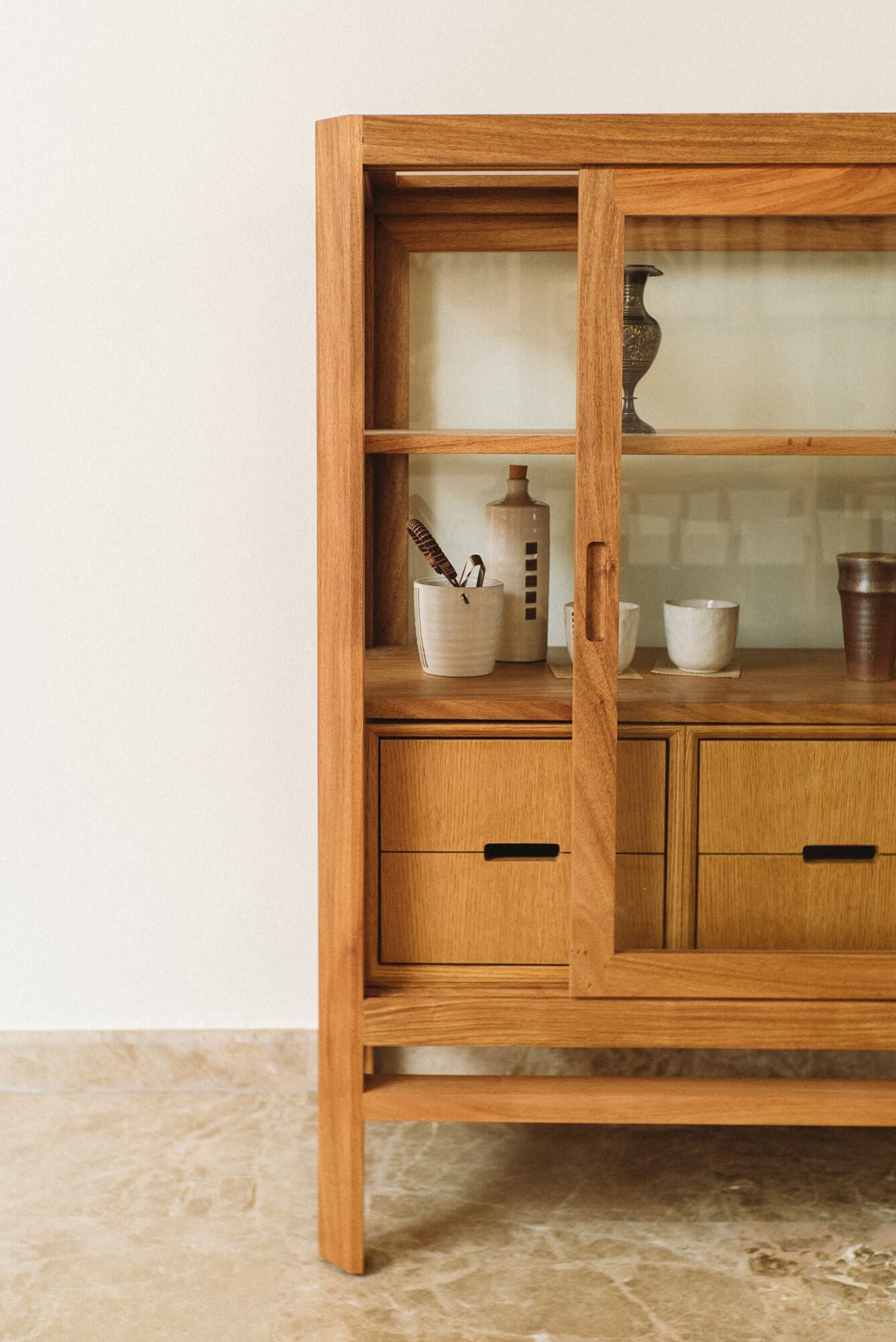 Des portes coulissantes en verre et des tiroirs de rangement dotés de poignées intégrées à la sélection précise de menuiseries et de bois, cette vitrine est époustouflante !