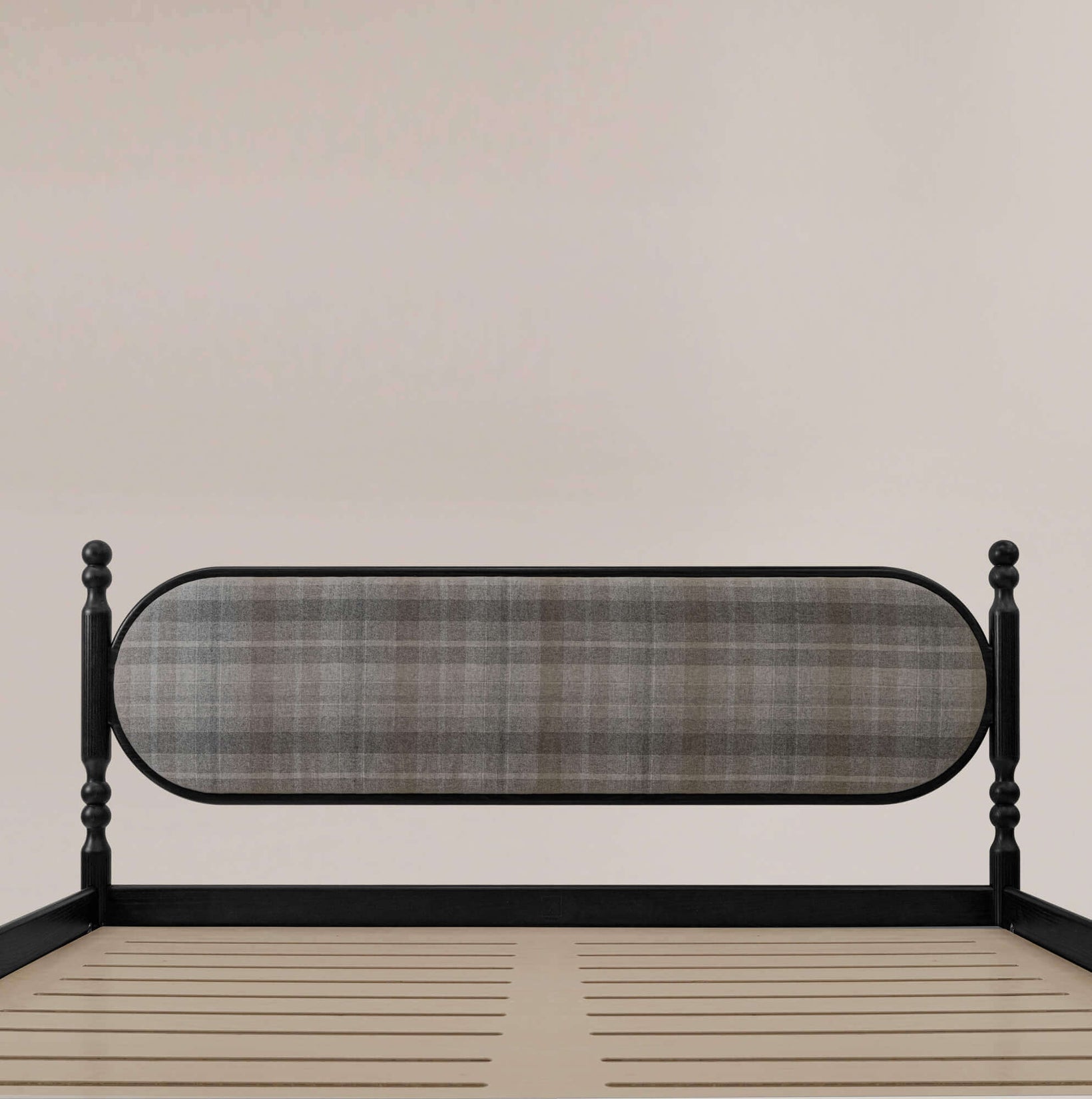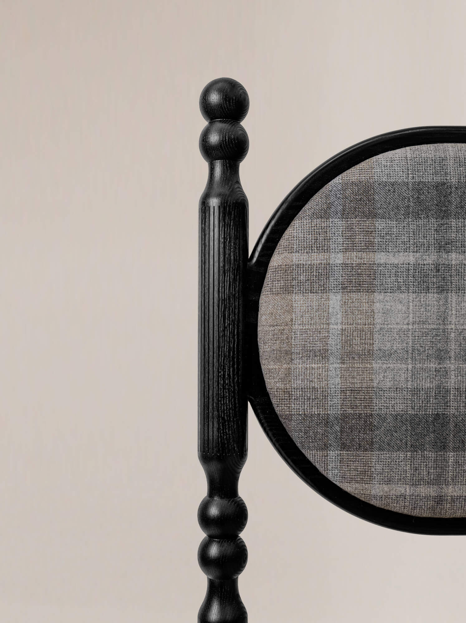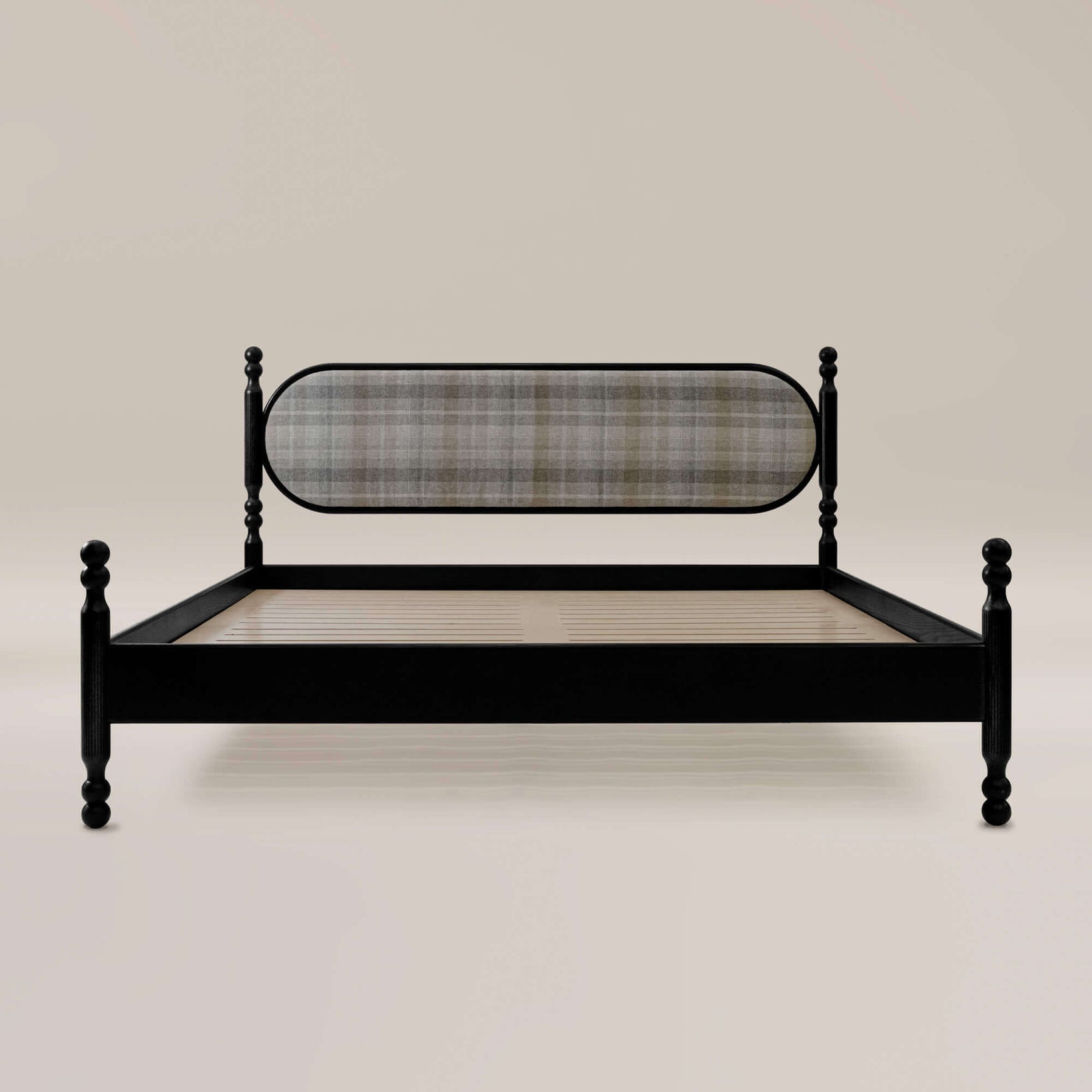 Le Lit Totem est né d'un désir de mêler l'ancien et le nouveau. Les montants du lit, inspirés d'une sculpture de l'ancienne Palmyre, et la tête de lit moderne en forme de piste de course, qui est tapissée de laine écossaise, donnent à cette pièce un aspect à la fois moderne et intemporel.