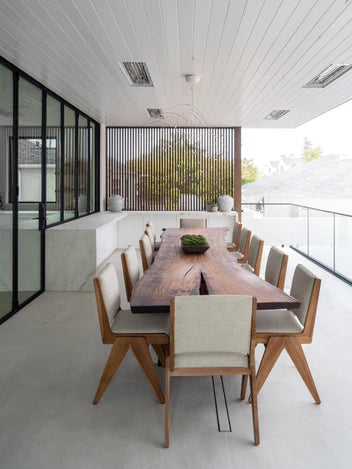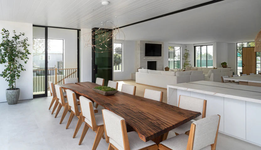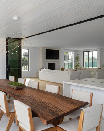 Cette énorme table à manger de plus de 15 pieds de long et de 38 à 46 pouces de large a été fabriquée à partir d'une dalle de singe de GL Veneer. Ses pieds de piédestal sont également en forme de singe solide et la pièce comporte également un support personnalisé provenant d'un fabricant de métal local à El Segundo, en Californie, Gerry Crumbliss.